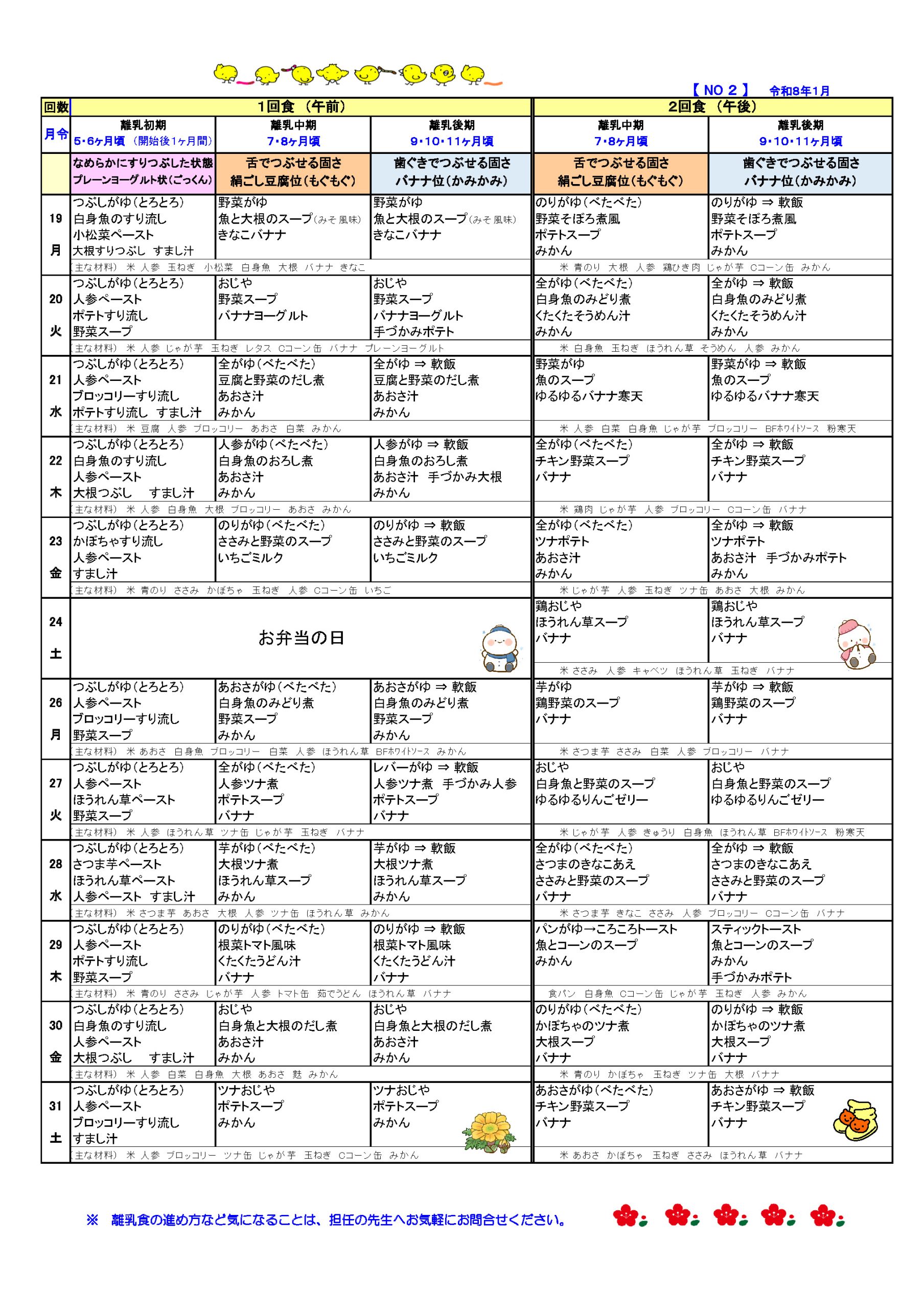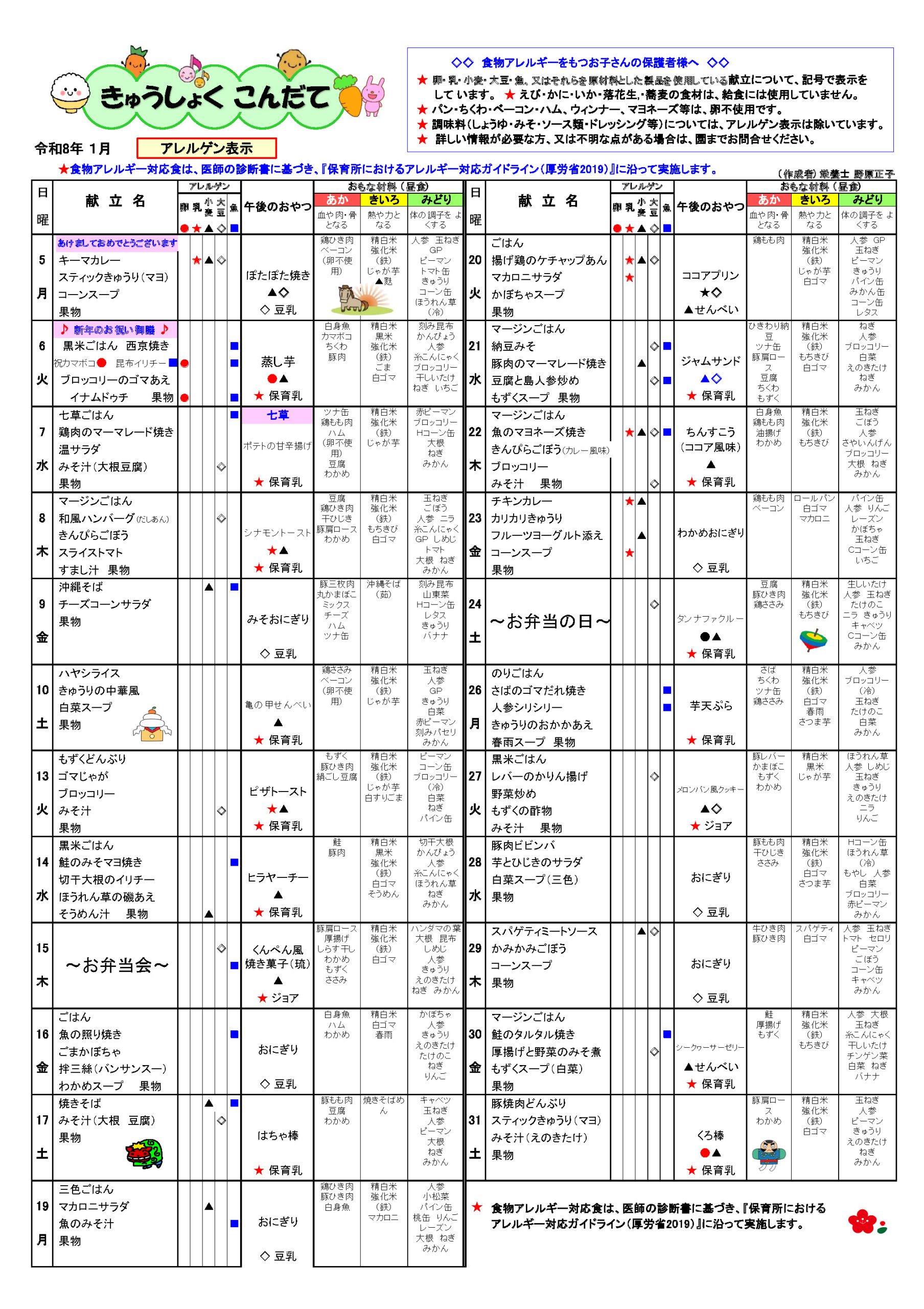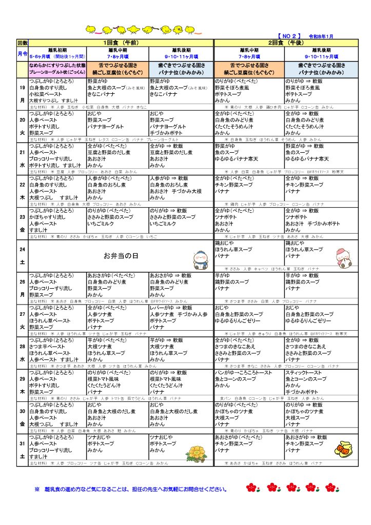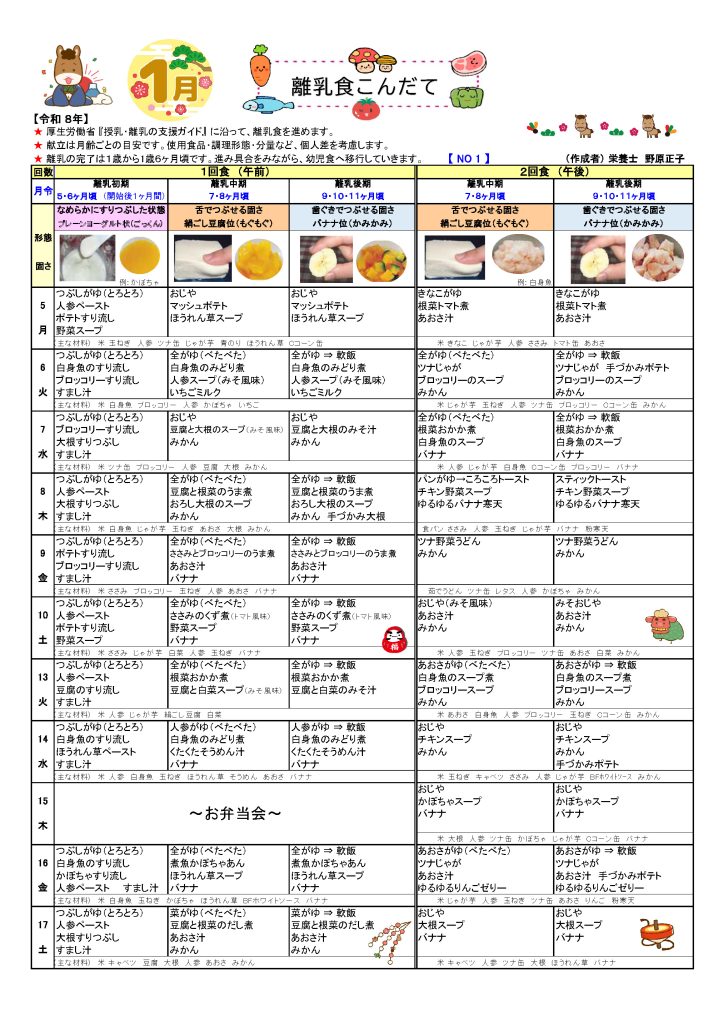 給食 ホーム > 給食 給食について 月~土は給食があります (おやつを含む)園では、栄養士が乳幼児期に必要な献立を作成し、バランスのとれた給食を提供します。毎月献立表を配布しますので給食の内容を把握して家庭での食習慣をつくりましょう。 アレルギー代替食除去食について 当園では「専門医からの指示を受けた場合」に、アレルギー疾患をもつお子さんの給食について連携を取り、適切で慎重な対応を行います。 2026年 献立表 2025年12月献立 2025年11月献立 2025年10月献立 2025年09月献立 2025年07月献立 2025年06月献立 2025年05月献立 2025年04月献立 離乳食 2025年12月離乳食献立 2025年11月離乳食献立 2025年05月離乳食献立